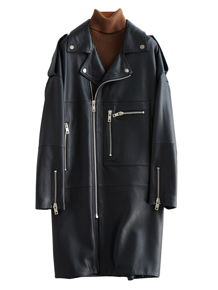 The Back to Black Coat because because we all know what happens when you go black. Keep 'em coming back in this over-sized, zip-down leather jacket with zippers, pockets and a turn down collar.