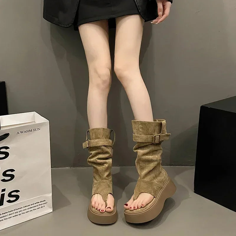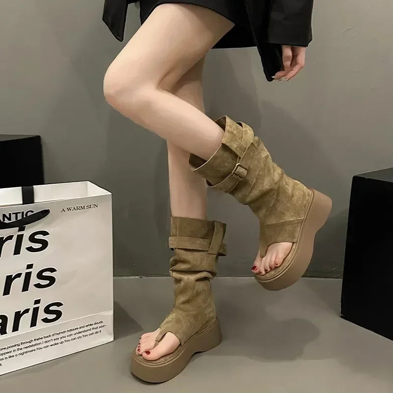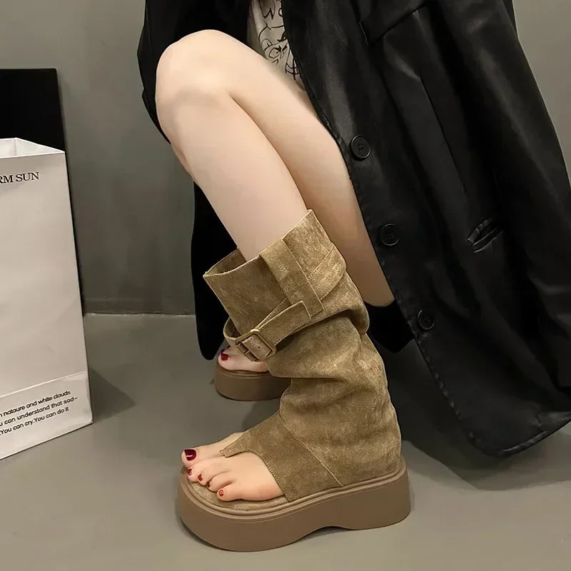 The Bentley boots because you're a trendsetter. Show 'em how it's done in these solid platform calf boots with open toes and an oversized fit.