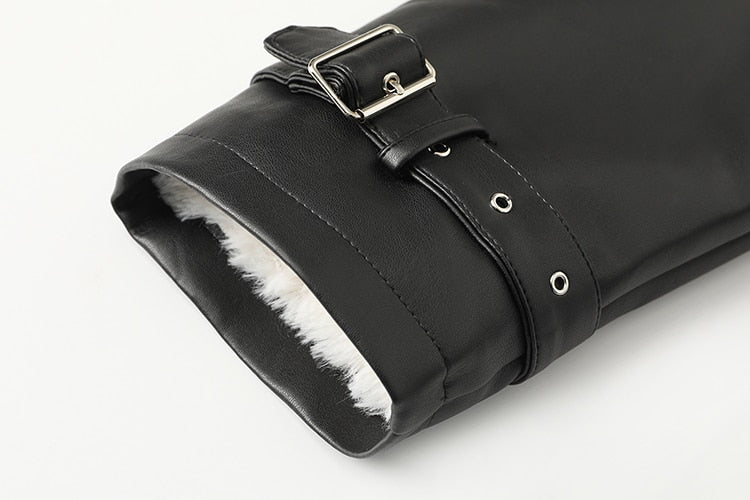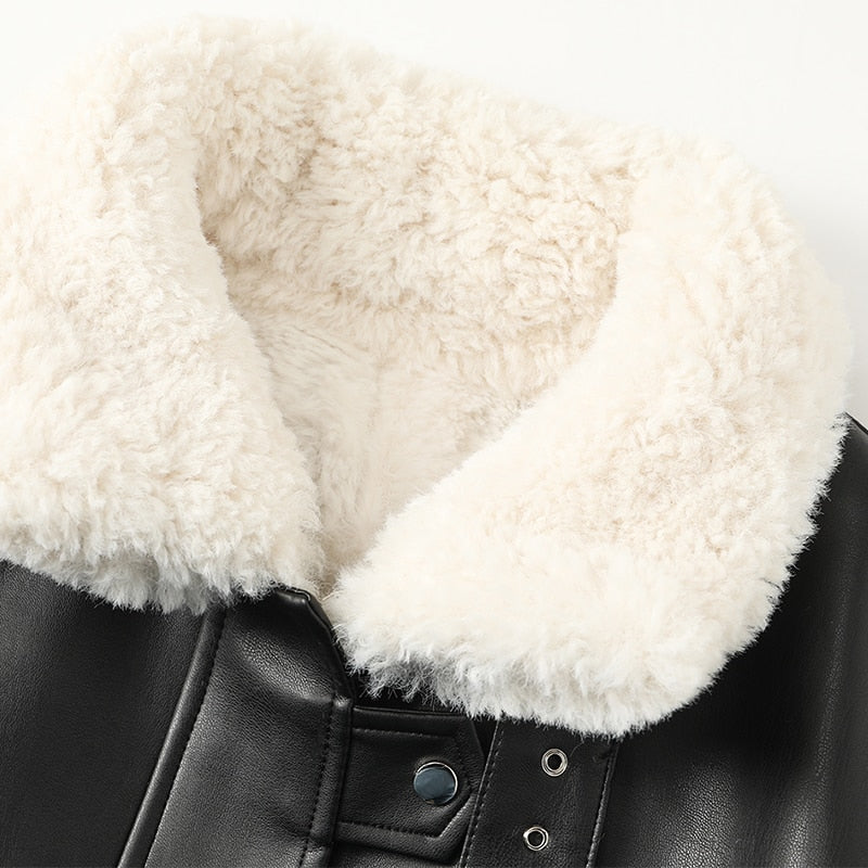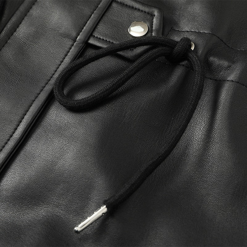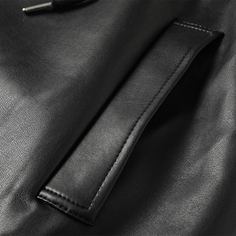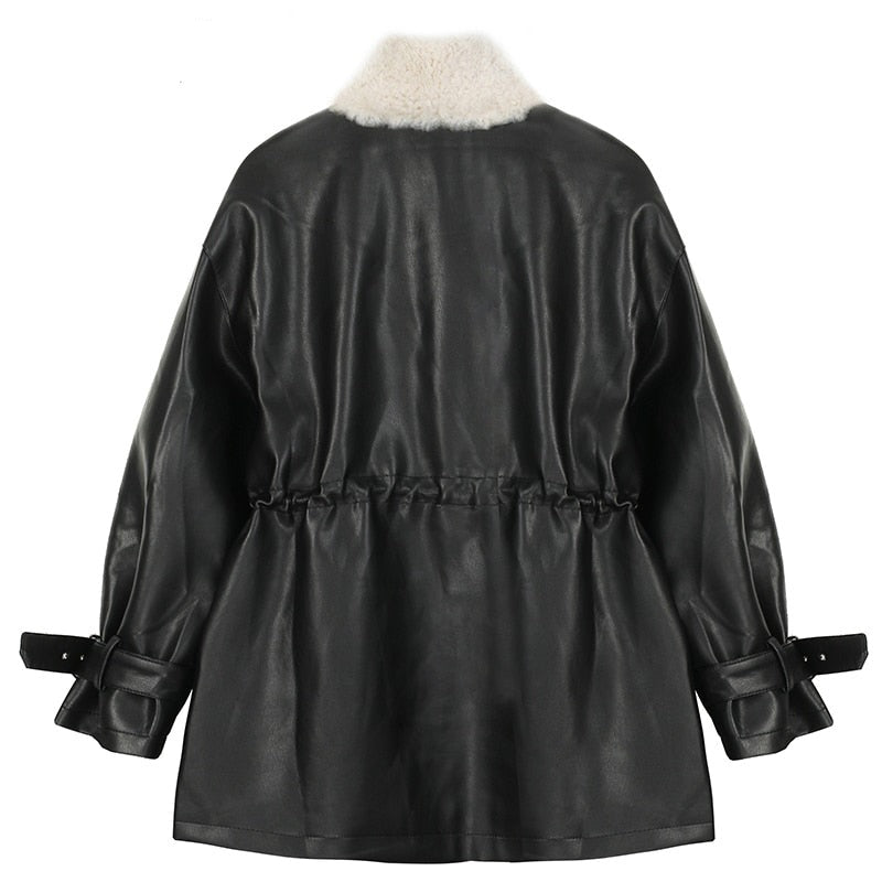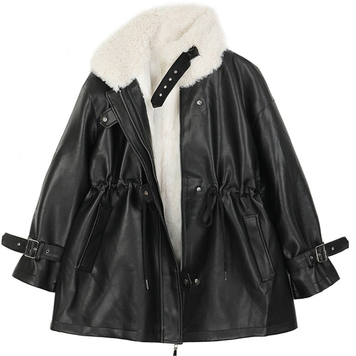 The Black Sheep Coat because you BAAAD. Break the rules in this solid, leather zip down coat with a wool-lined interior, a drawstring waist , a turn down collar and wrist detailing.