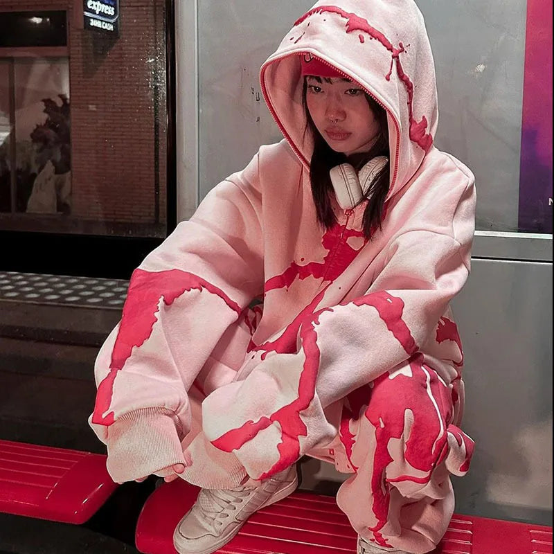 The Bolted sweatsuit because you're energy is electric. Strike a pose in this printed, oversized zip-down hoodie with matching high waist sweatpants.