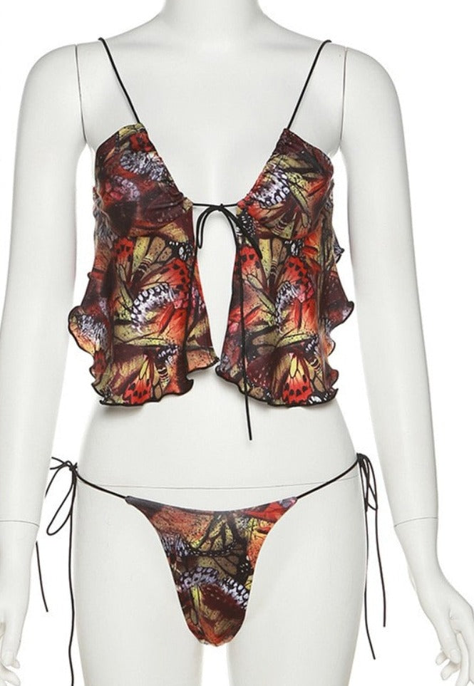 The Bree 2 piece because who else gonna rock this like you? Nobody can. Show 'em how it's done in this printed, ruffled, spaghetti strap swimsuit top with an open center and string tie closures and matching string bottoms.