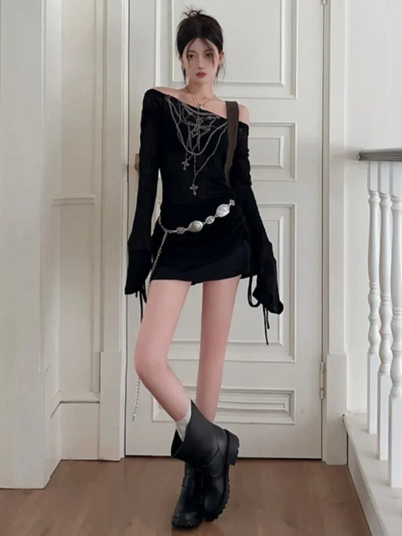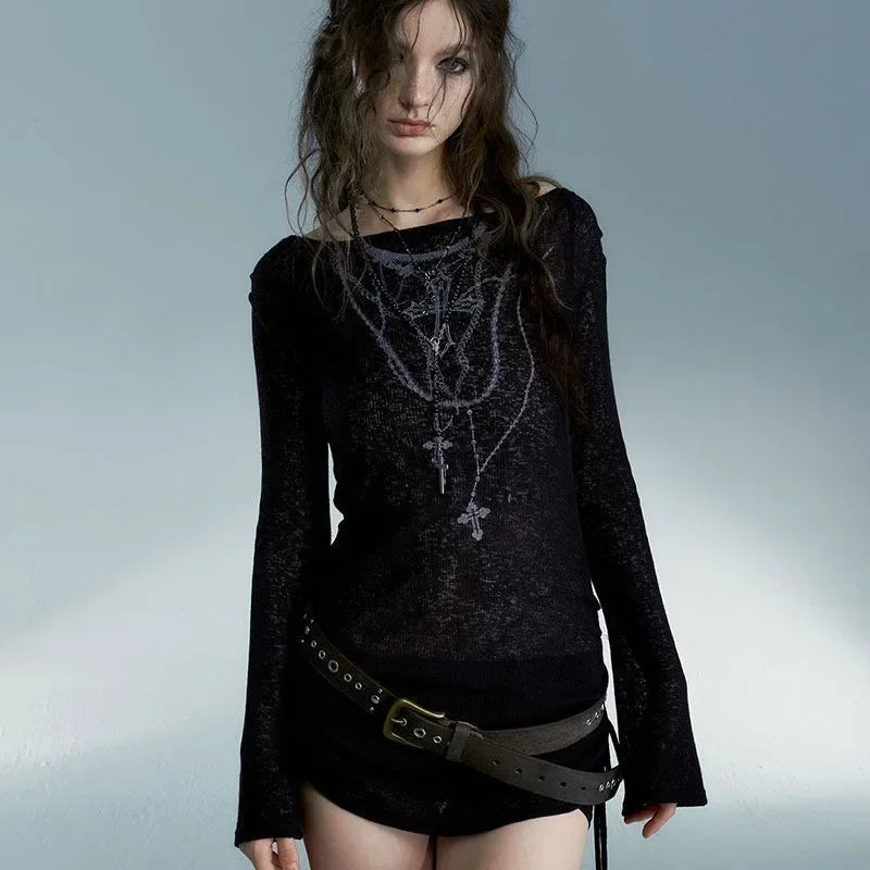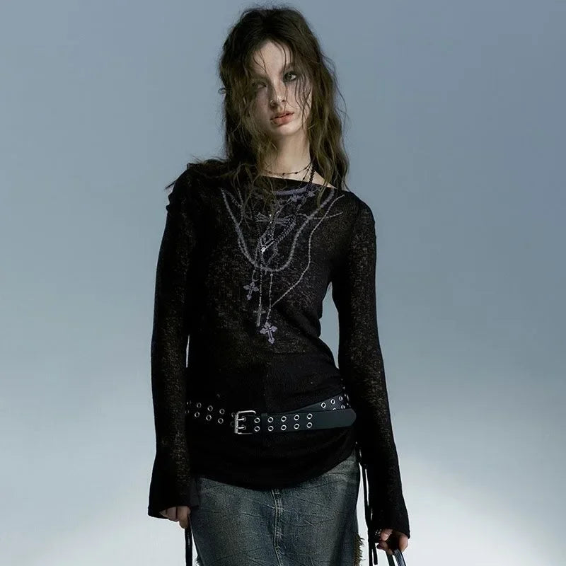 The Chain Reaction top because you're the reason they do it. Set trends in this sheer, off-the-shoulder tunic with long sleeves and a chain print.