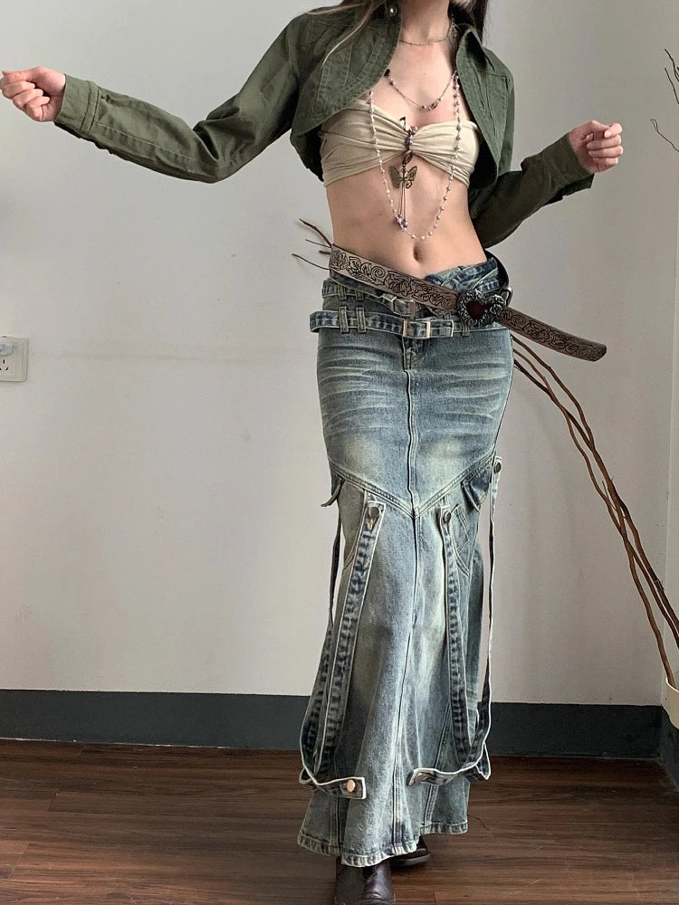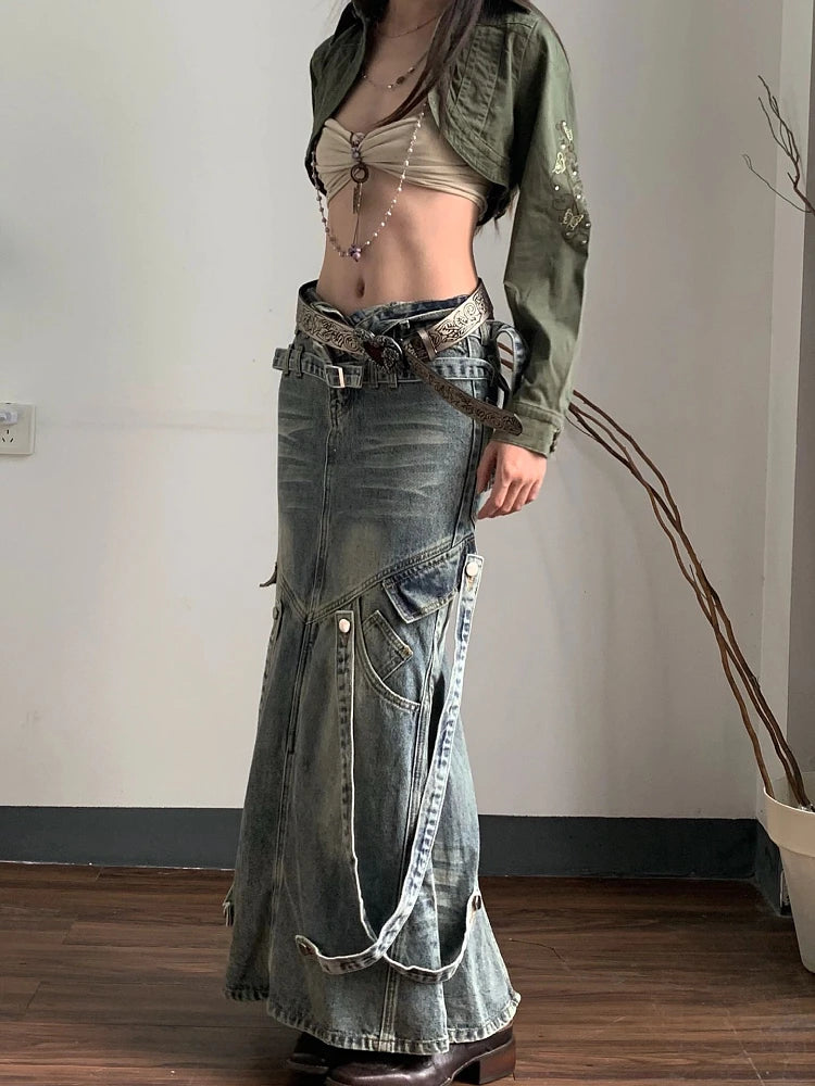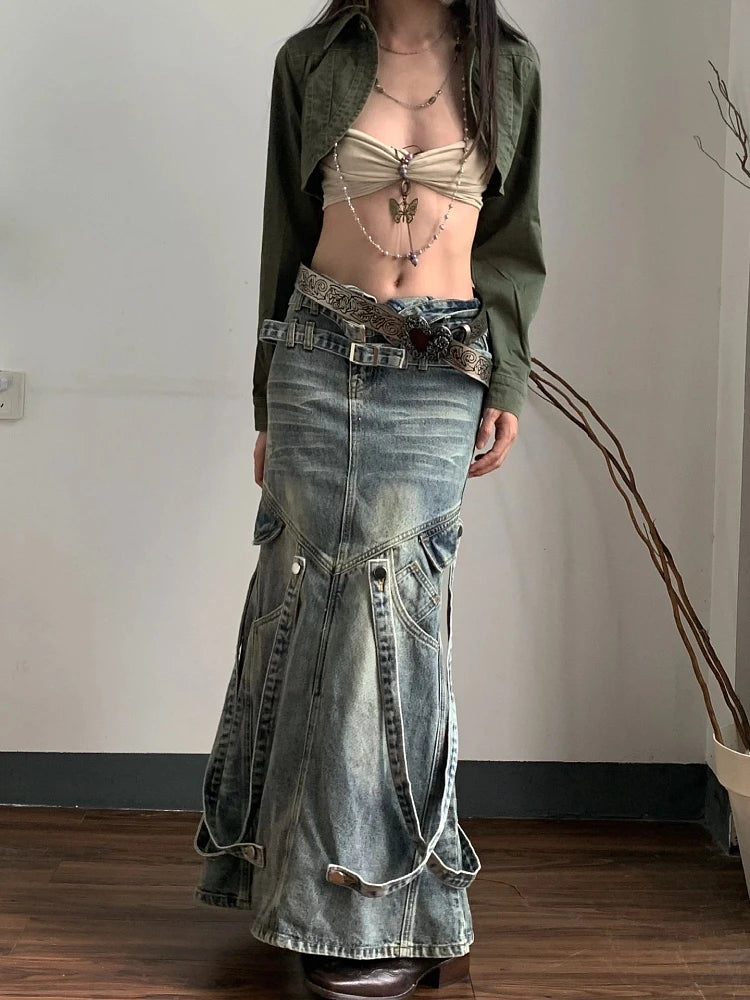 Genie in a Bottle Maxi because you're everyone's wish. Be a dream in this full length denim maxiskirt with a lot waist , pockets and a flared bottom.