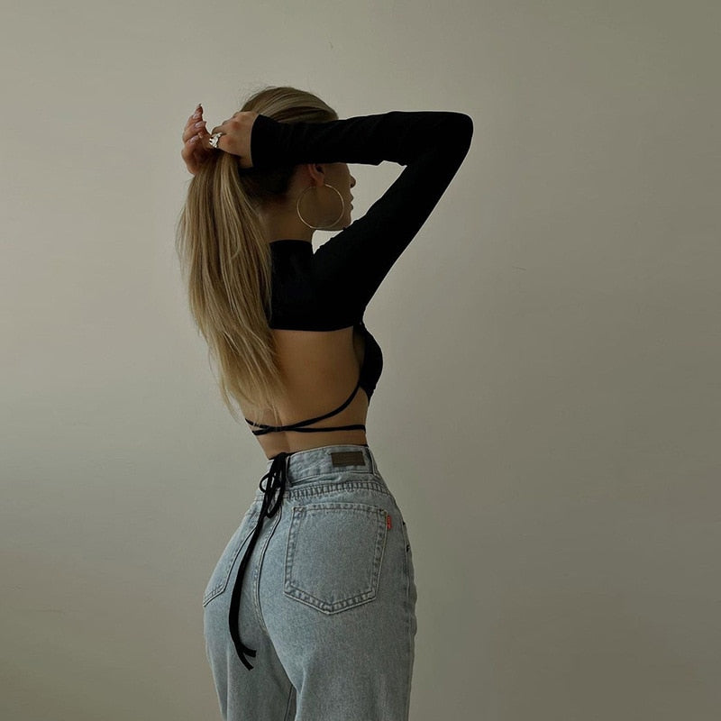 Get Wild Crop Top because you're a savage. Unleash the beast in this backless, printed crop top with criss-cross ties and long sleeves.