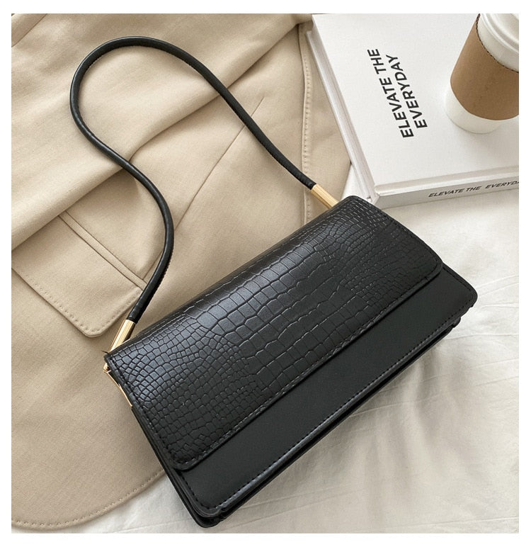 in this rectangle shoulder bag with a crocodile print flap and button closure.