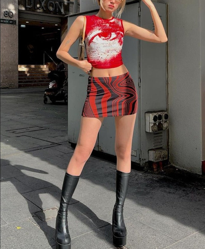 The Show Me Somethin' Tank because your eyes are the window to their souls. Keep 'em lookin' in this sleeveless, eye- print crop top tank.