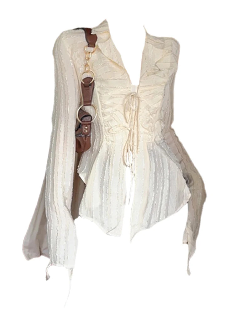 The Snatched top because you stay dressed to impress. Keep it cute in this solid, corset blouse with bell sleeves and a turn-down collar.