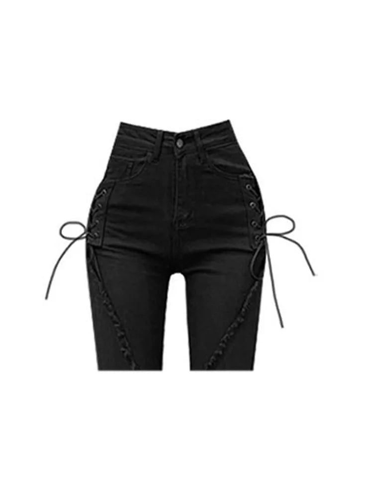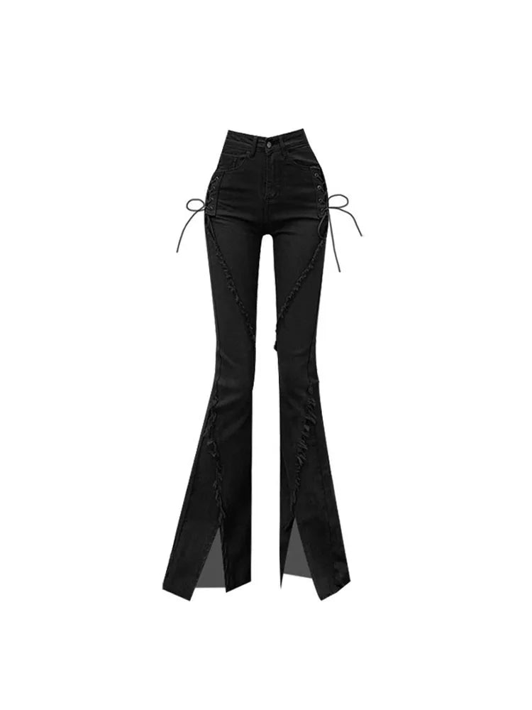 The Take a Bow Jeans because you're the main attraction. Get a standing ovation in these high waist, denim, open-flare jeans with lace-down hips and fringe detail.