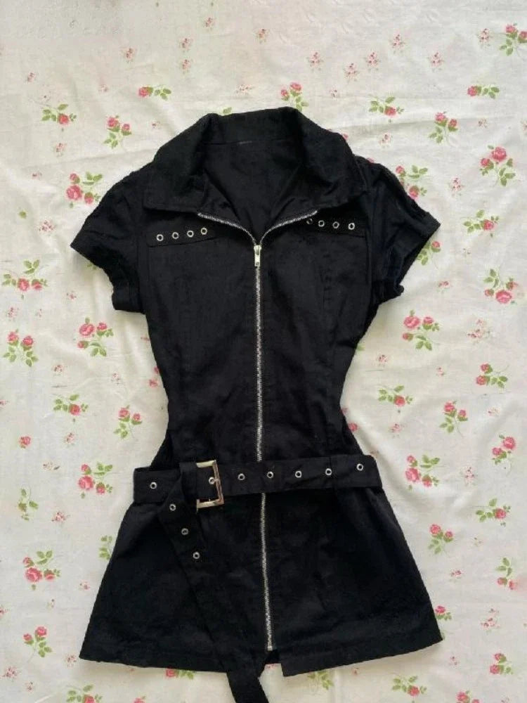 The Cop Out Jumpsuit because fashion is law. Enforce the rules in this belted, zip-down jumpsuit with a collar and short sleeves.